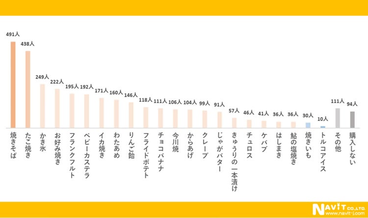 「屋台で食べ物を買ったことはありますか?」という質問を複数選択可能で行ったところ、「焼きそば」が491人、「たこ焼き」が438人、「かき氷」が249人という順になりました。
