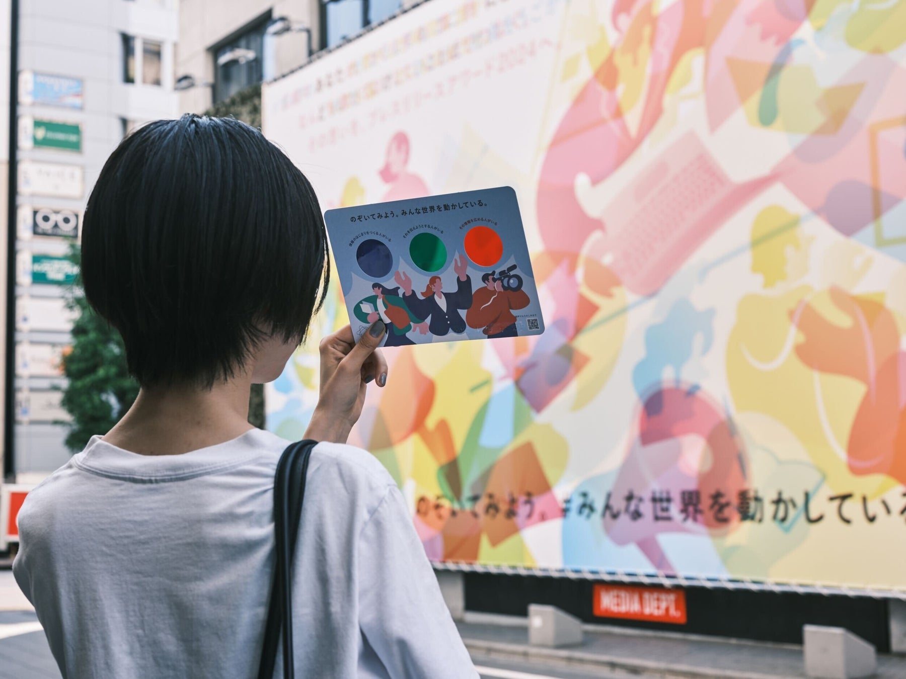 3通りの景色が浮上!フィルター越しにのぞくと、#みんな世界を動かしている。 プレスリリースアワード2024のメッセージ看板と音声実況ガイド