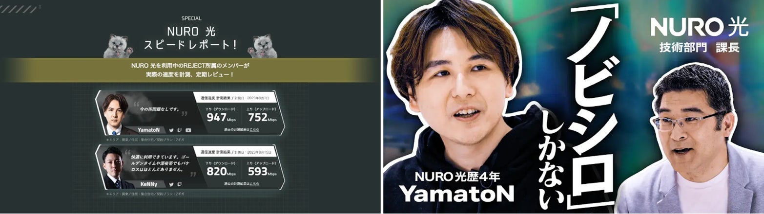 2023年4月に「NURO 光」は、「REJECT」とチームスポンサーシップ契約を締結。年間を通じて様々な取り組みを行ってまいりました。「REJECT x NURO 光」特設サイト(https://www.nuro.jp/lp/reject/special/)では、「NURO 光」を利用する「REJECT」所属のメンバーが実際の速度を計測し、定期レビューを実施。そのほか対談企画などを通じて、選手やメンバーによるプロの視点からの声を真摯に受け止め、さらなるサービス向上に努めています。