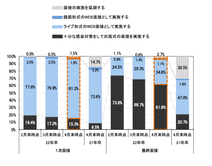 - 就活生が4月後半に受けた面接のうち、WEB面接は81.8%で前年同時期より12.8%減少【図5、6】