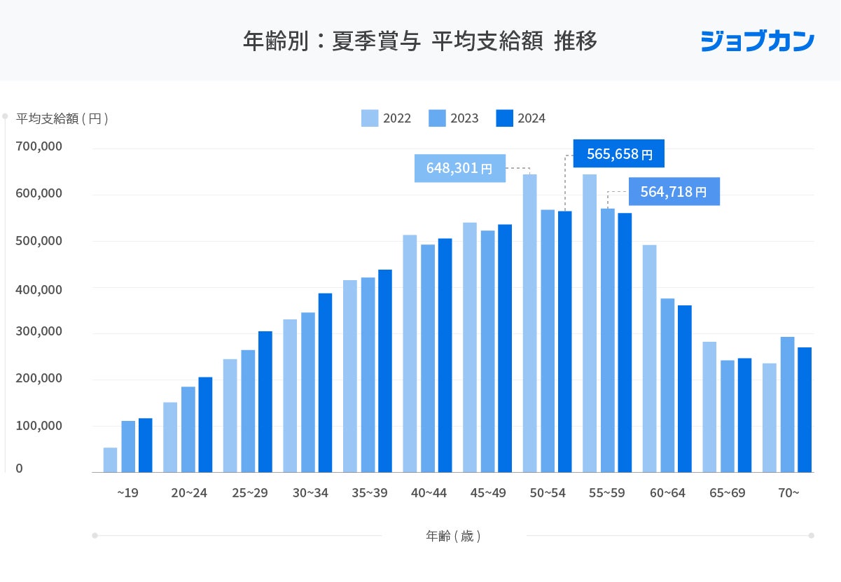年齢別に夏季賞与平均支給額の推移を見ると、支給額が最大値になるのは50歳台で、2022年「648,301円(50~54歳)」2023年「564,718円(55~59歳)」2024年「565,658円(50~54歳)」となり、50歳台までは年齢を重ねるごとに支給額も高くなっていく傾向が現れました。