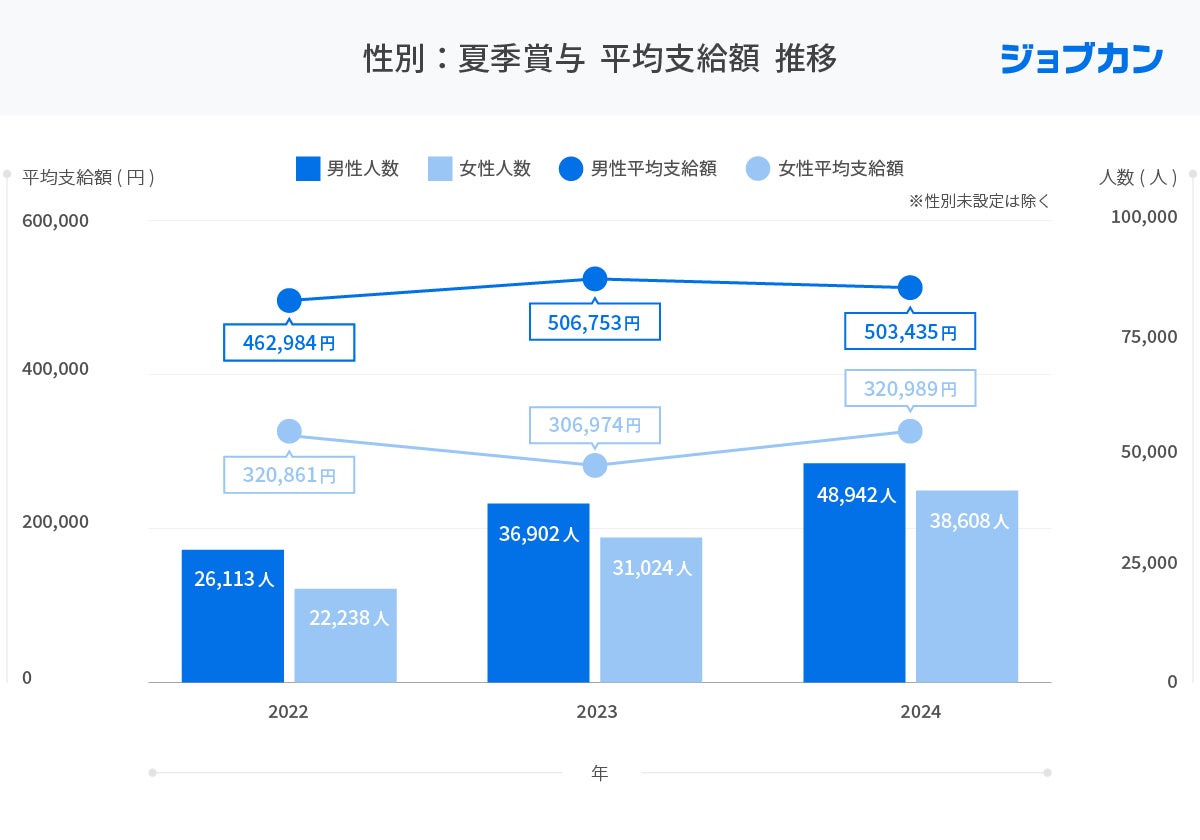 性別に夏季賞与平均支給額の推移を見ると、男性は2022年「462,984円」2023年「506,753円」2024年「503,435円」、女性は2022年「320,861円」2023年「306,974円」2024年「320,989円」となり、女性の平均賞与額は男性の平均賞与額の約6割にとどまる結果となりました。