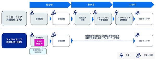 「フォローアップ配信機能」は、これまで先生が宿題の結果を確認し、フォローアップ対象の児童・生徒を目視で決定、追加の課題を手動配信いただいていました。今回の機能追加により、先生はあらかじめフォローアップの対象とする宿題正答率を設定し、宿題実施後に対象となった児童・生徒に自動で追加の課題が配信できるようになります。これまで通り、手動での配信も選択できるため、児童・生徒一人ひとりの学習状況を見て、細かく対象を決めたい先生は手動で、児童・生徒の宿題の提出結果を見る時間が取れず手が回らない先生や、学習内容や学習習慣の定着を自動化したい先生は自動でといったように、先生のご意向に合わせて使い分けていただくことが可能です。