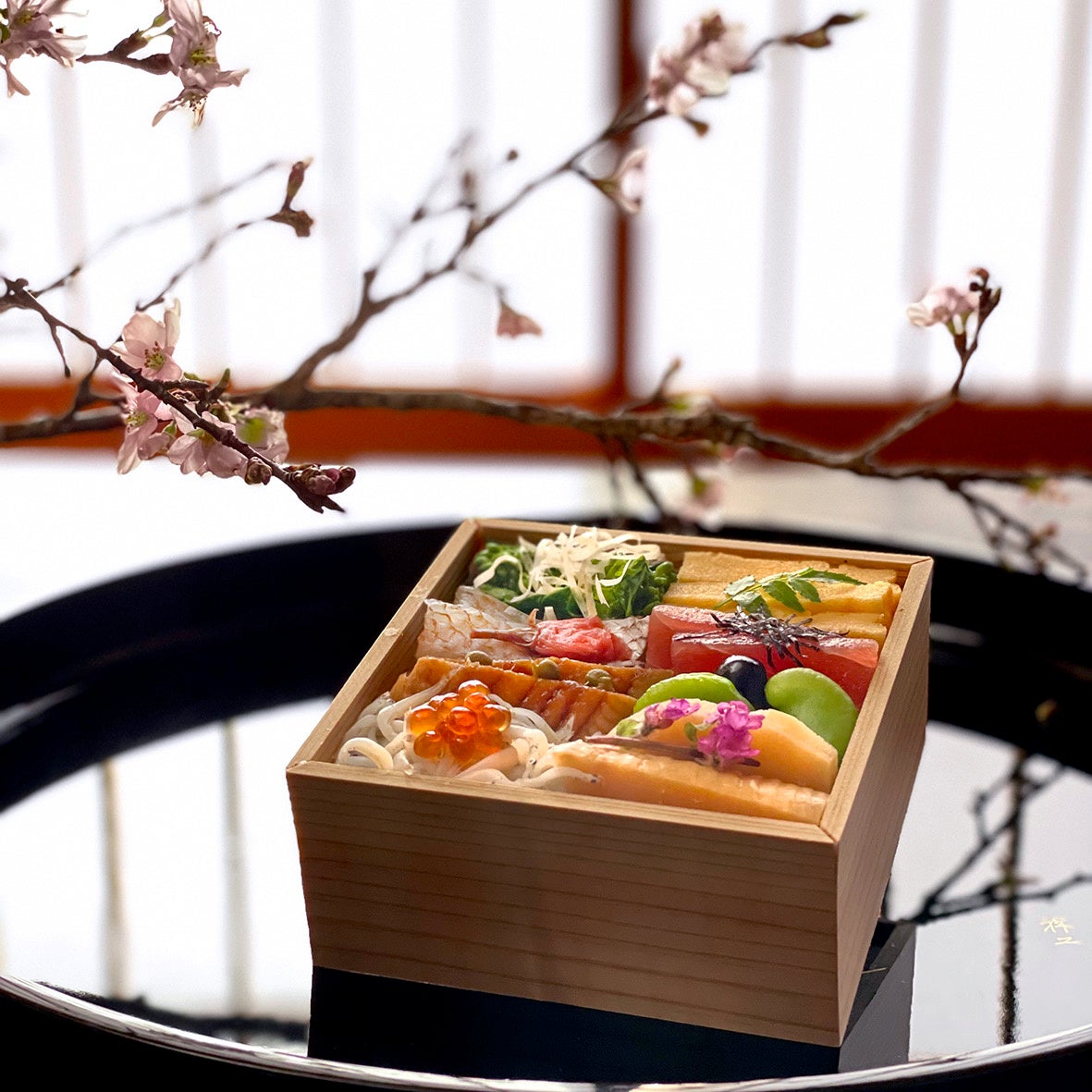 旬の釜揚げしらすや桜えびなどを彩り良く盛り付けたのっけいなり、海老やサーモンの押寿司、さらに2種の巻寿司を詰合せた、行楽の際にシェアしやすい一折。