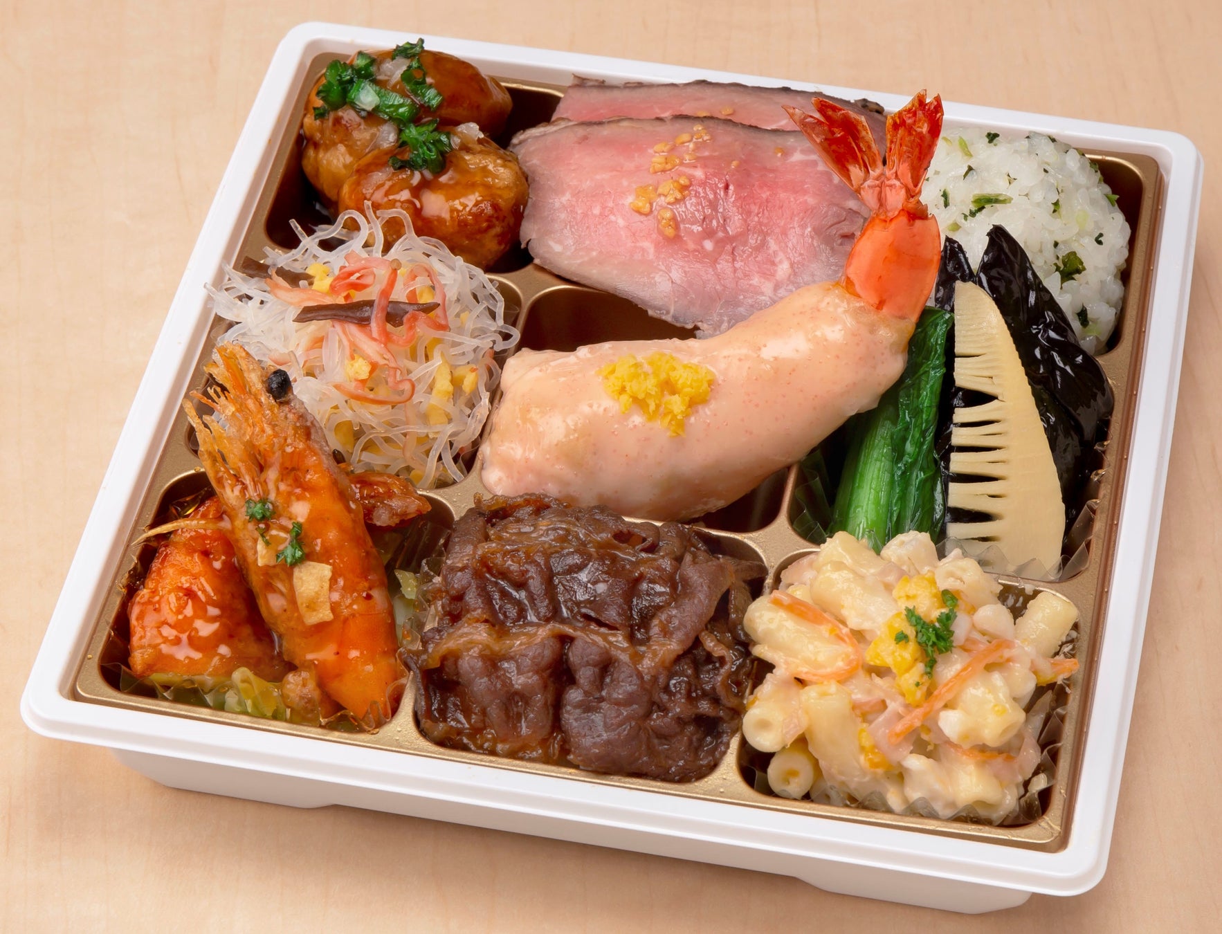 牛めし、大海老マヨ~明太マヨソース~、ガーリックシュリンプ、ガーリックローストビーフソテー、京都産九条葱南蛮唐揚げなど、柿安ダイニングの人気商品を一度に楽しめるお弁当。
