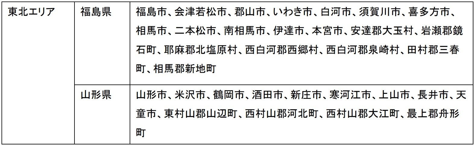 北海道、宮城、福島、山形、東京、神奈川、埼玉、千葉、茨城、栃木、群馬、愛知、静岡、岐阜、三重、京都、大阪、兵庫、滋賀、奈良、広島、岡山、福岡、佐賀 の一部エリア