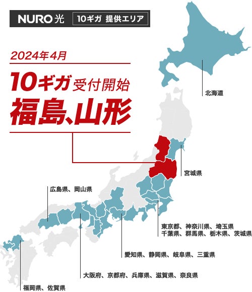 ソニーネットワークコミュニケーションズ株式会社は、高速光回線サービス「NURO(ニューロ) 光」の提供エリアを拡大し、福島県と山形県内にて最大通信速度10Gbps(*1)のサービス提供を開始します。東北エリアにおいては、2023年2月に宮城県でサービス提供を開始しており、このたびの拡大によって、東北エリアでは3県で「NURO 光」の10ギガサービスが利用できるようになります。申し込み及びサービス提供は、4月15日より順次開始予定です。