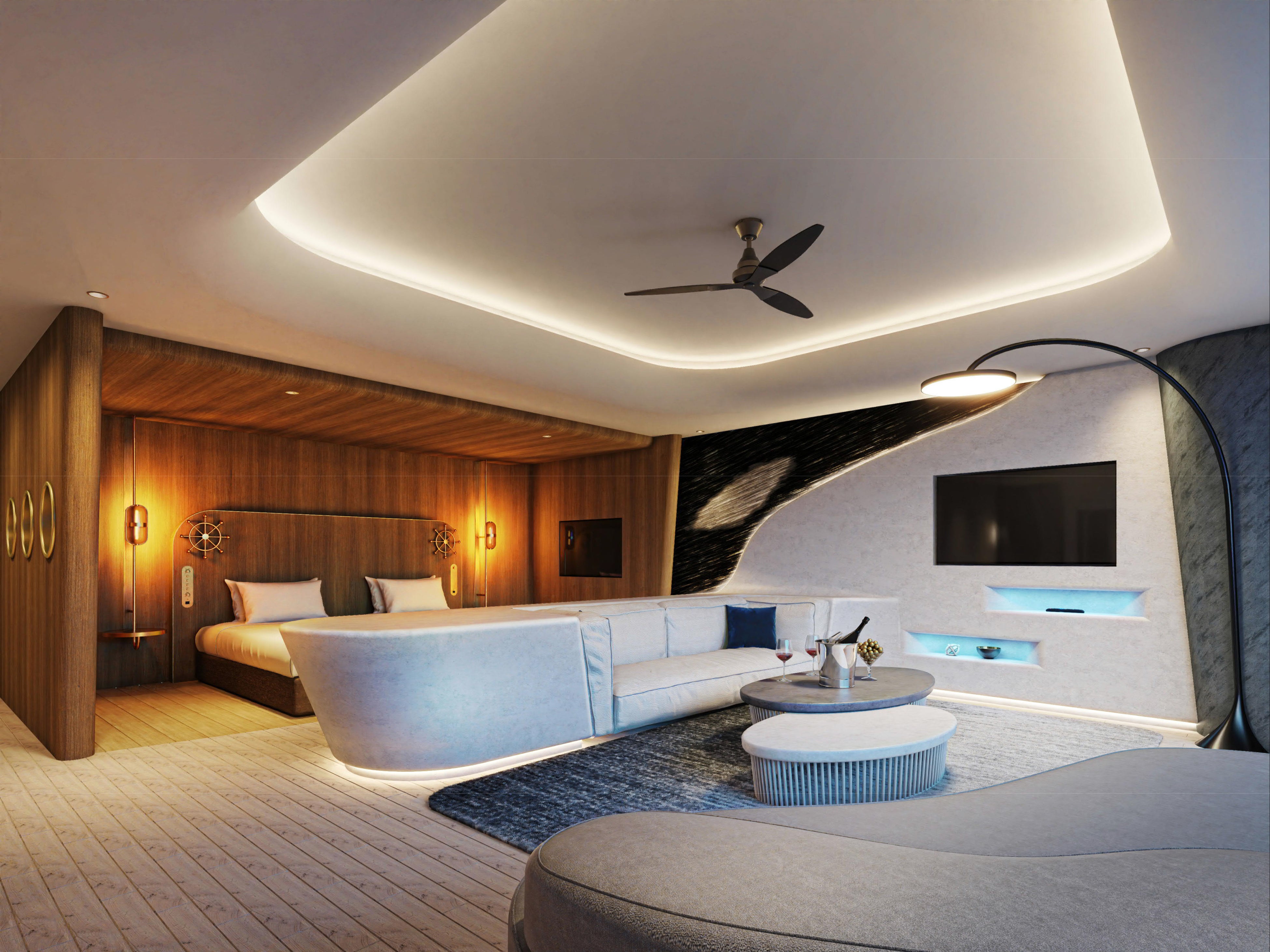 ワンダーキャビンをコンセプトに、大海原を航海するような客船を想起させるインテリアと大迫力な水槽、シャチカラーの白と黒をモチーフにした優雅な空間がクルージング気分を盛り上げます。日々移ろいゆく景色を望みながら心地よい時間をお過ごしいただける特別なお部屋です。