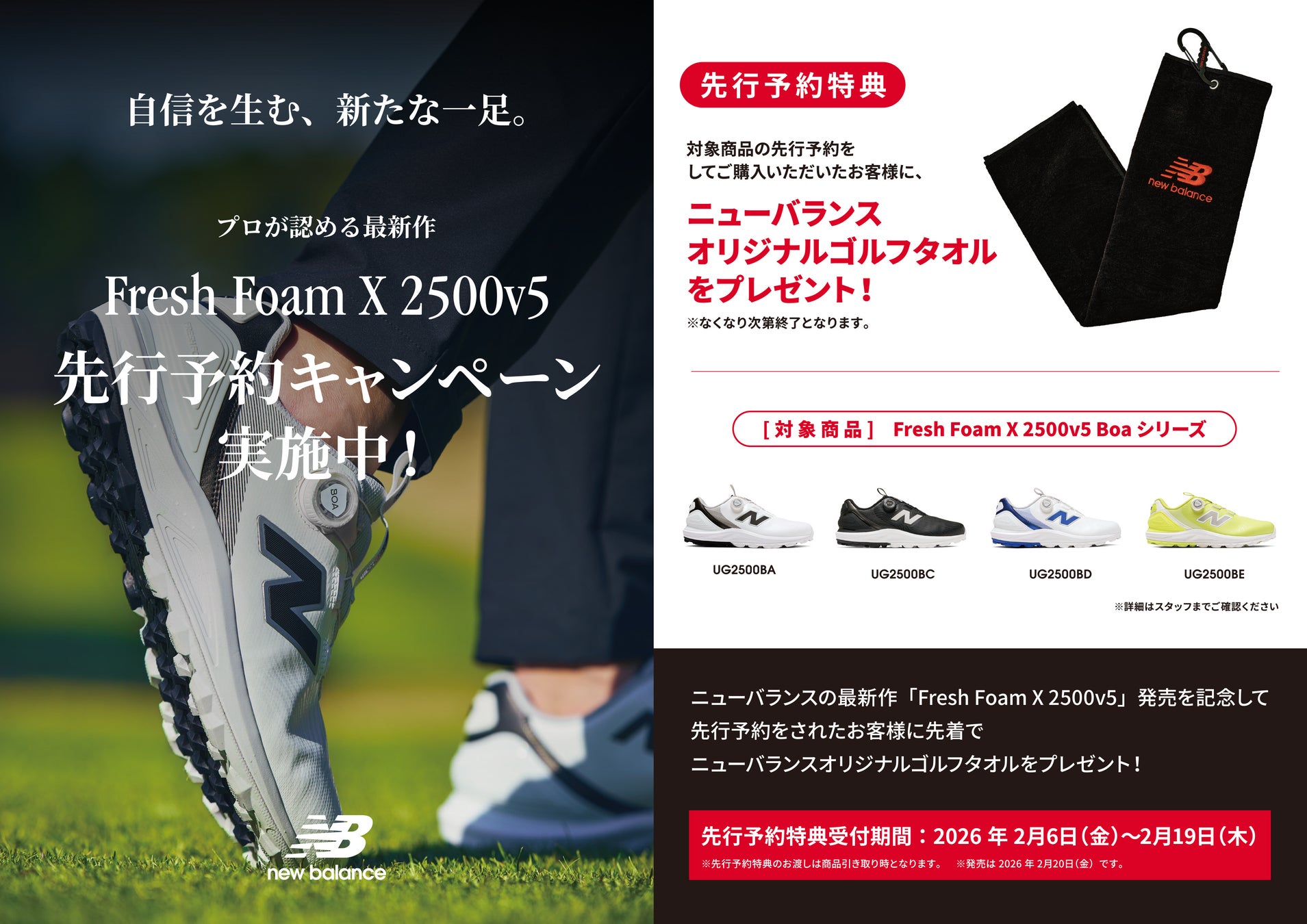 ニューバランス最新作「Fresh Foam X 2500 v5」発売を記念し、先行予約をされたお客様に先着で、ニューバランスオリジナルゴルフタオルをプレゼントいたします。