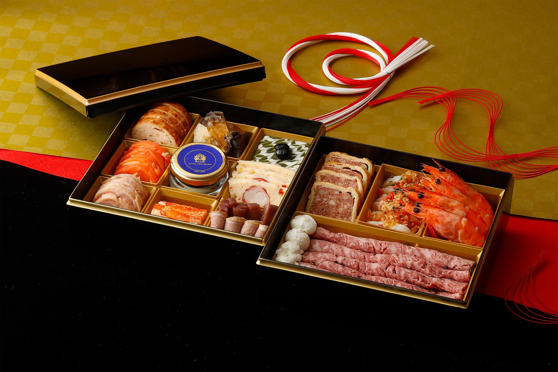 ローストビーフには赤身と脂身のバランスが良い“瑞穂牛”のロース肉を使用、噛むほどに肉の旨味が口いっぱいに広がる贅沢な味わいをご堪能いただけます。また、大粒のキャビアやオマール海老のテリーヌ、鮑のマリネや蟹のサフランムースなど、ワインにも日本酒にもよく合う贅沢な味わいをたっぷりと盛り込みました。2025年の幕開けにふさわしい華やかなおせちは、ご家族や大切な方々との笑顔の集いのお食事だけでなく、ローストビーフおせち 三段重新年のご挨拶を兼ねた贈り物としてもおすすめです。