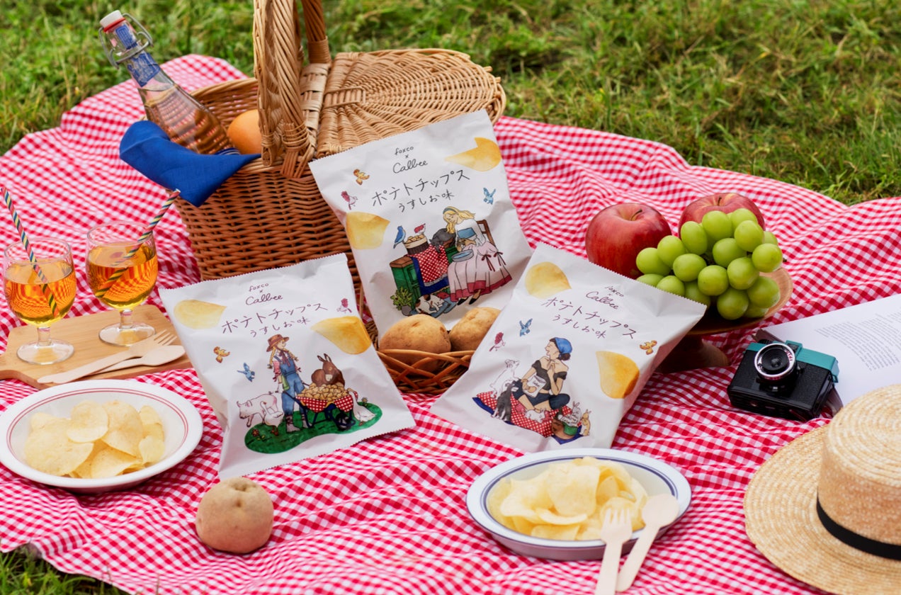 収穫したじゃがいもが美味しいポテトチップスとなって私たちの手元に届くストーリーをあしらった“Harvest” “Cooking”“Picnic”という3つの柄を書き下ろしました。ぜひ3種類コレクトして楽しんでください!