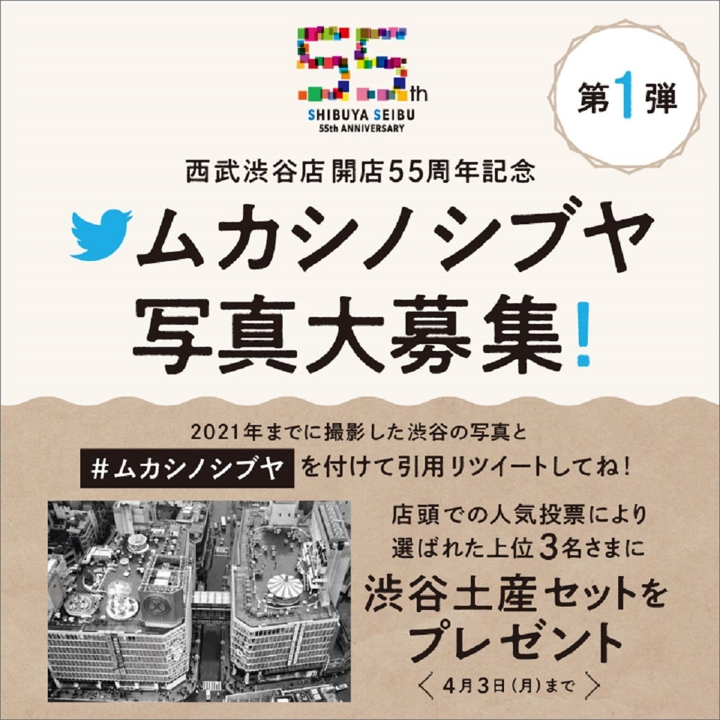 2021年までの「昔の渋谷」を映した写真を募集します。今ではもう見られない懐かしい渋谷の風景やお店、当時から変わらないお気に入りスポット、待ち合わせ場所・・・。あなたの“思い出の渋谷写真”とハッシュタグ『#ムカシノシブヤ』を付けて、対象のキャンペーン投稿を引用リツイートしてください。投稿写真はA館5階=連絡通路に展示し、来店されたお客さまに投票していただきます。投票数の多かった上位3名の方には、賞品として渋谷土産セットをプレゼント。
