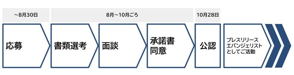 応募者の方は必要書類と共にエントリーいただき、面談を経て「プレスリリースの日」である10月28日にPR TIMESが公認発表することを予定しています。委嘱にあたっては承諾書への同意をお願いいたします。