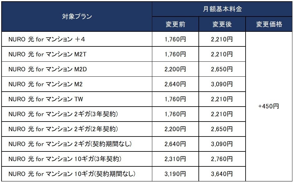 昨今、部材価格の高騰や人件費・設備導入費用の上昇が続くなか、これまで集合住宅における設備部材の安定調達とリーズナブルな価格の維持に努めてきました。今後も、10ギガサービスをはじめとするさらなる高品質で安定したサービスを提供するため、既存の「NURO 光 for マンション 2ギガ」、「NURO 光 for マンション 10ギガ」ほか対象プランの月額基本料金において一律450円の改定を実施します。