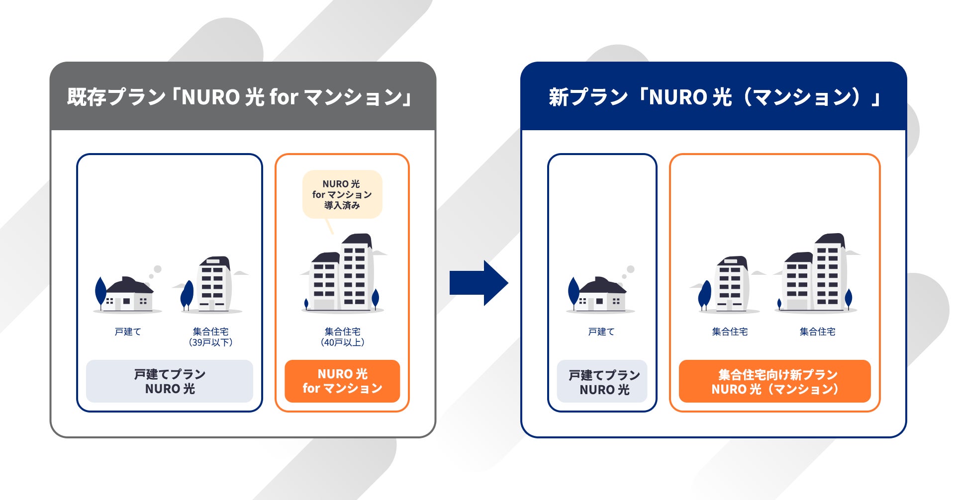 また、これまで「NURO 光 for マンション」の設備が導入されていない集合住宅では、戸建てプランの「NURO 光」を選択する必要がありましたが、今後は新規で申し込んだ方を対象に新プランが適用され、よりお得に利用することができます。