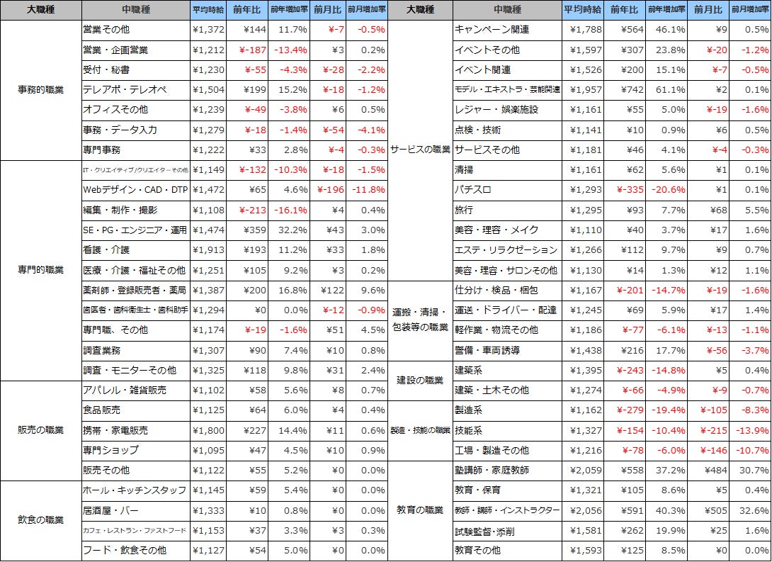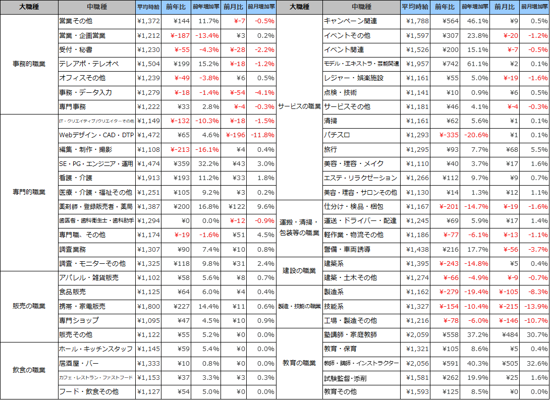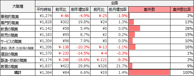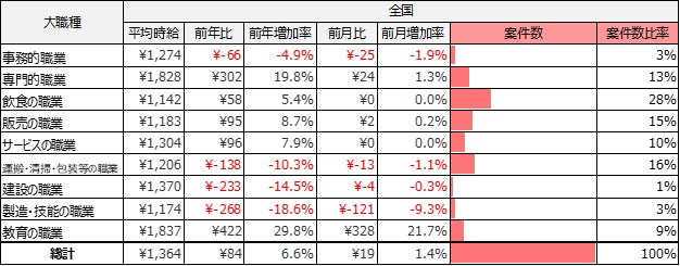 事務的職業は1,274円(前年比66円減、前月比25円減)、専門的職業は1,828円(前年比302円増、前月比24円増)、飲食の職業は1,142円(前年比58円増、前月比±0円)、販売の職業は1,183円(前年比95増、前月比2円増)、サービスの職業は1,304円(前年比96円増、前月比±0円)、運搬・清掃・包装等の職業は1,206円(前年比138円減、前月比13円減)、建設の職業は1,370円(前年比233円減、前月比4円減)、製造・技能の職業は1,174円(前年比268円減、前月比121円減)、教育の職業は1,837円(前年比422円増、前月比328円増)となりました。