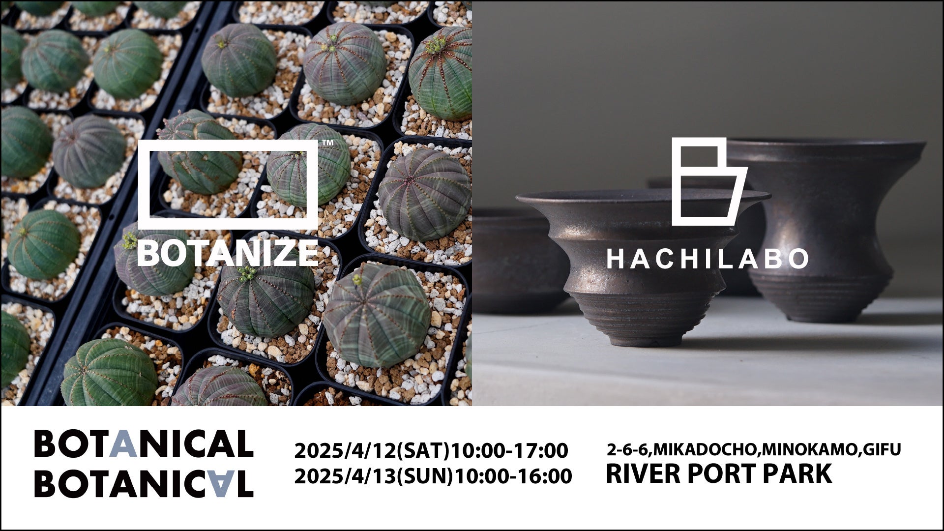 イベントで「BOTANIZE」は、人気作家N/OH(ノウ)の鉢や、オベサなどの植物の販売、「HACHILABO(ハチラボ)」は、ECサイトで取り扱っている人気作家の鉢を販売します。ぜひお越しください。