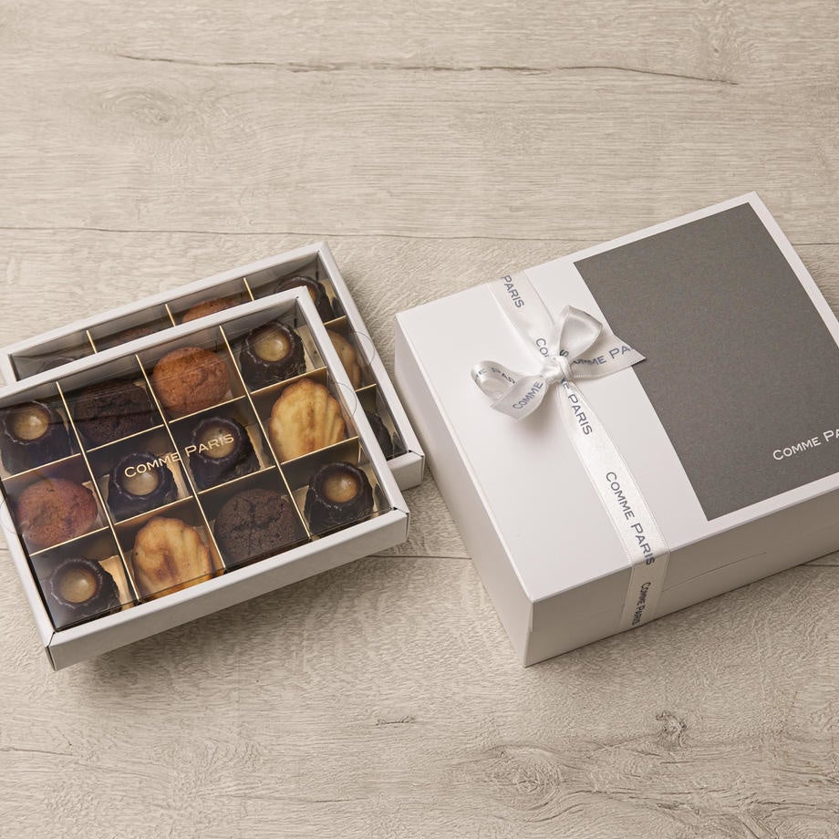 "BONHEUR"はフランス語で”幸せ"を意味します。手にとってくださる皆さまに幸せな時間をお過ごしいただけますように。当店人気の焼菓子四種を贅沢に詰め込んで。COMME PARIS人気のプチサイズ焼菓子4種を当店オリジナルクリアケースに詰め、スタイリッシュなボックスにお入れいたします。