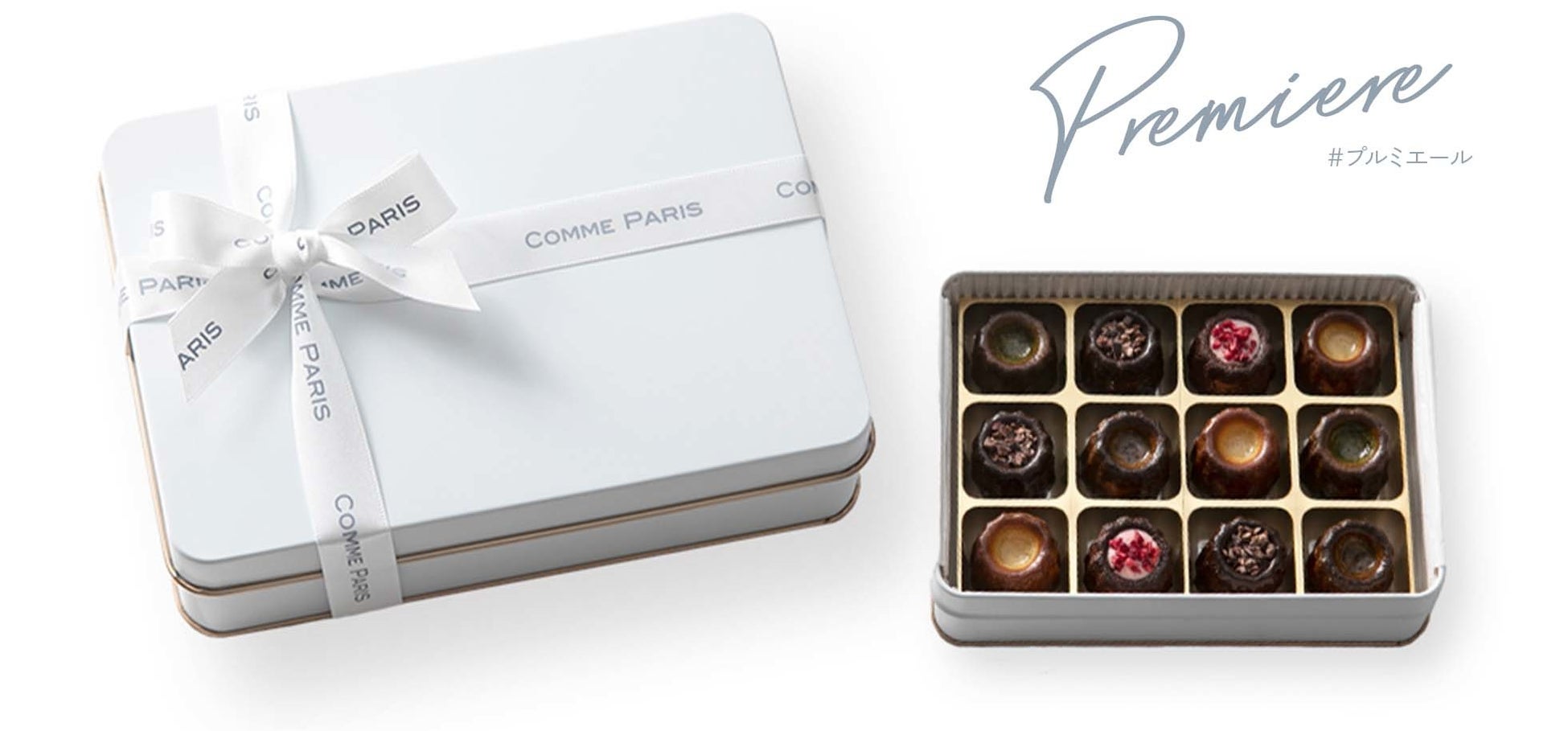 プレミアムラインでしか手にできない大好評のフラワーホワイトのオリジナル缶に、Premièreでしか手にできない5種類のカヌレを詰め合わせた特別な商品です。COMME PARIS定番のプレミアムラインです。
