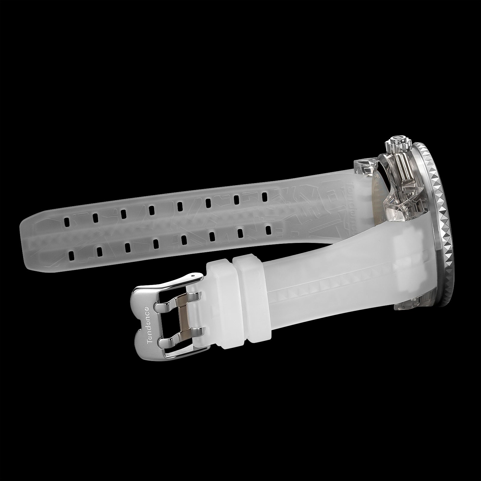 ■品番:TY046032 ■価格:63,800円(税込) ■ケースサイズ:W50㎜×H50㎜ ■ケース素材: ナイロン・ステンレスケース ■ケースカラー:クリア ■ベルト:シリコン ■ベルトカラー:クリアホワイト ■ガラス:ミネラルガラス ■防水性:10気圧防水 |