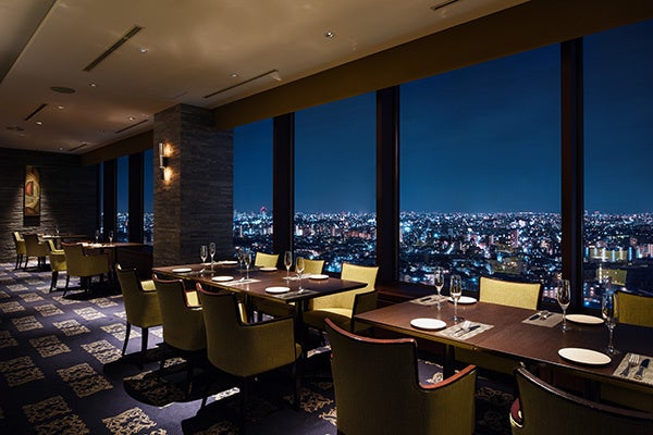 ホテル最上階の25階に位置する店内からは、まるで宝石をちりばめたような夜景が見渡せます。7:00p.m.までのご来店予約をいただいたお客さまは、より景色をお楽しみいただける窓側のテーブル席をご用意いたします。夜景をバックに特別なひと時をお楽しみください。