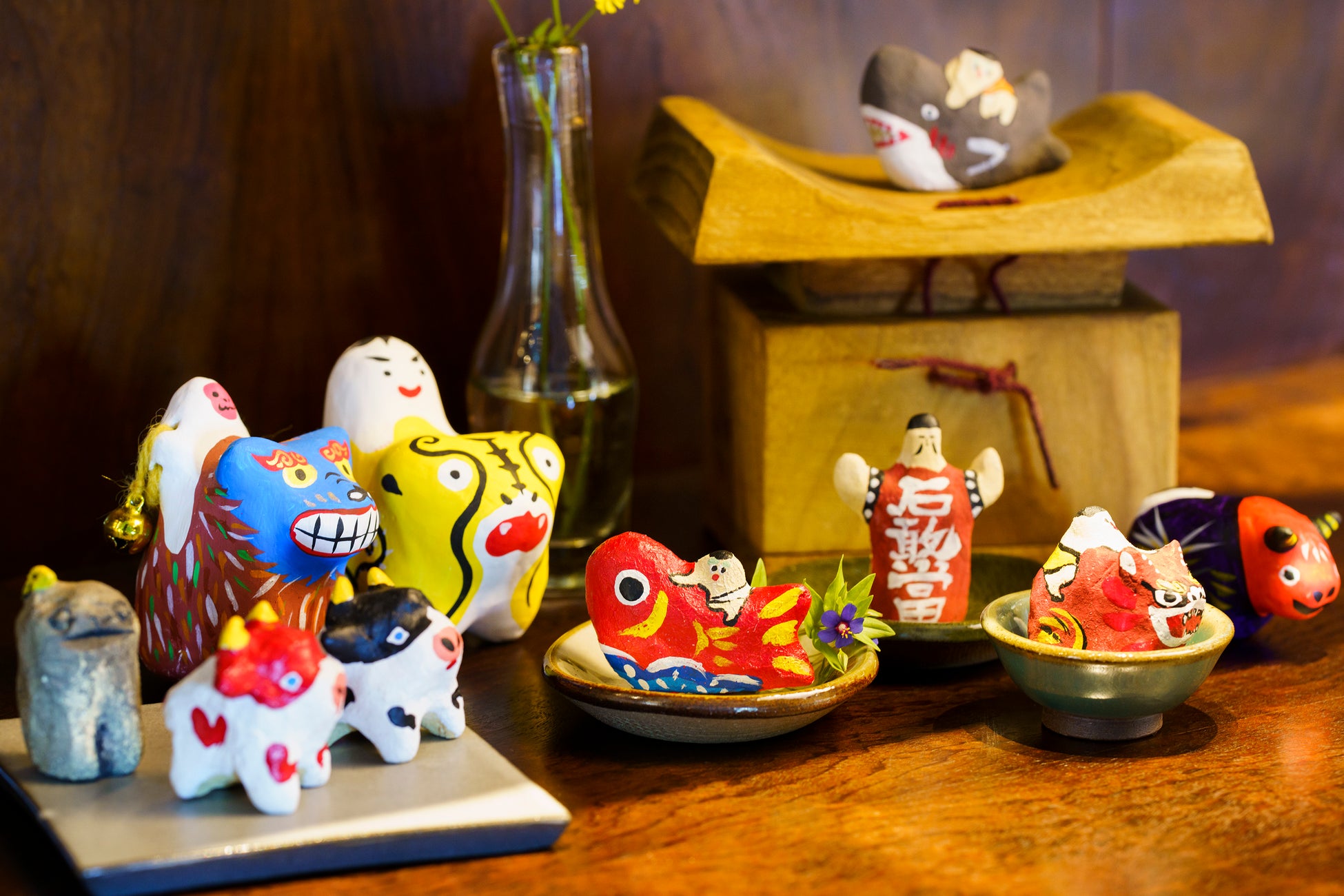 子どもたちの笑顔と笑い声は邪気を祓うと考えられ、「ユッカヌヒー」にはハーリーの競漕と合わせて各地で玩具市が開かれてきました。星のや沖縄のショップでは、ユーモラスな表情と温もりが魅力の琉球玩具が並ぶ「琉球玩具市」を開催するほか、道場では張子の絵付け体験も行います。古典的な張子から、くすりと笑えるユニークな張子まで、個性豊かな琉球玩具に子どもだけでなく大人も魅了されます。