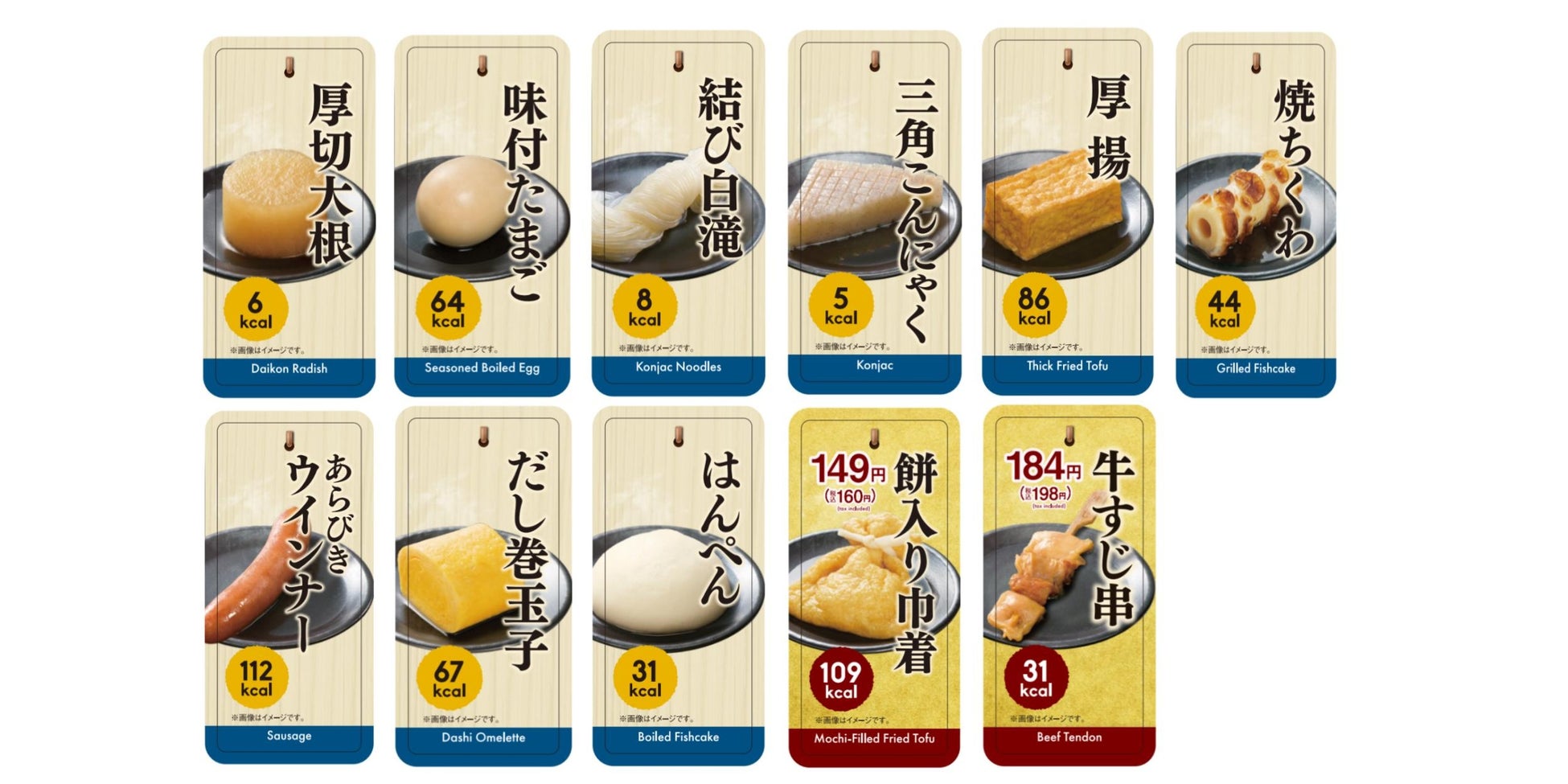 一部商品を除き、均一価格121円(税込130円)にて発売いたします。今年のラインアップは、「厚切大根」「味付たまご」「結び白滝」などの定番商品をはじめ、13種類(地域限定商品含む)のこだわりを詰め込んだおでんを取り揃えました。