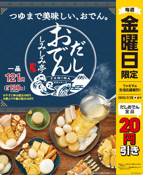 このたびの「だしおでん しみしみ亭」発売を記念し、2024年9月24日(火)〜2025年2月28日(金)までのおでん発売期間中、毎週金曜日に全品20円引きセールを開催いたします。ファミマのおでんをぜひこの機会に、おトクにお楽しみください。