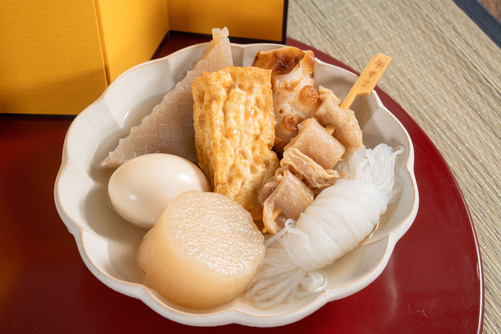 おでんの組み合わせは自由自在で、例えば、「厚切大根」「結び白滝」「三角こんにゃく」の3品の具材で19キロカロリーと低カロリーな組み合わせもお楽しみいただけます。低カロリーで美味しいランチやおつまみにぴったりなラインアップをぜひお楽しみください。