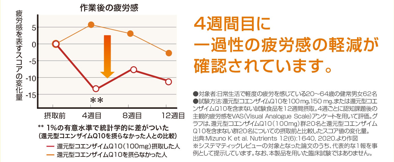 日常生活において軽度の疲労を感じている20~64歳の健常男女62名を対象に、還元型コエンザイムQ10を100mg、150mg、またはプラセボ※11を12週間摂取し、4週間ごとに認知課題後の主観的疲労感をVAS ※12アンケートを用いて評価する臨床試験において、還元型コエンザイムQ10 100mgを含む摂取群では、摂取前から摂取開始4週時点の主観的疲労感の指標の変化量がプラセボ群と比較して有意に低いという結果が得られています。