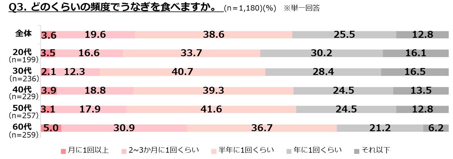③食べる頻度は「半年に1回くらい」が最多で、次いで「年に1回くらい」。60代は2~3ヶ月に1回以上が36%と頻度が高い。