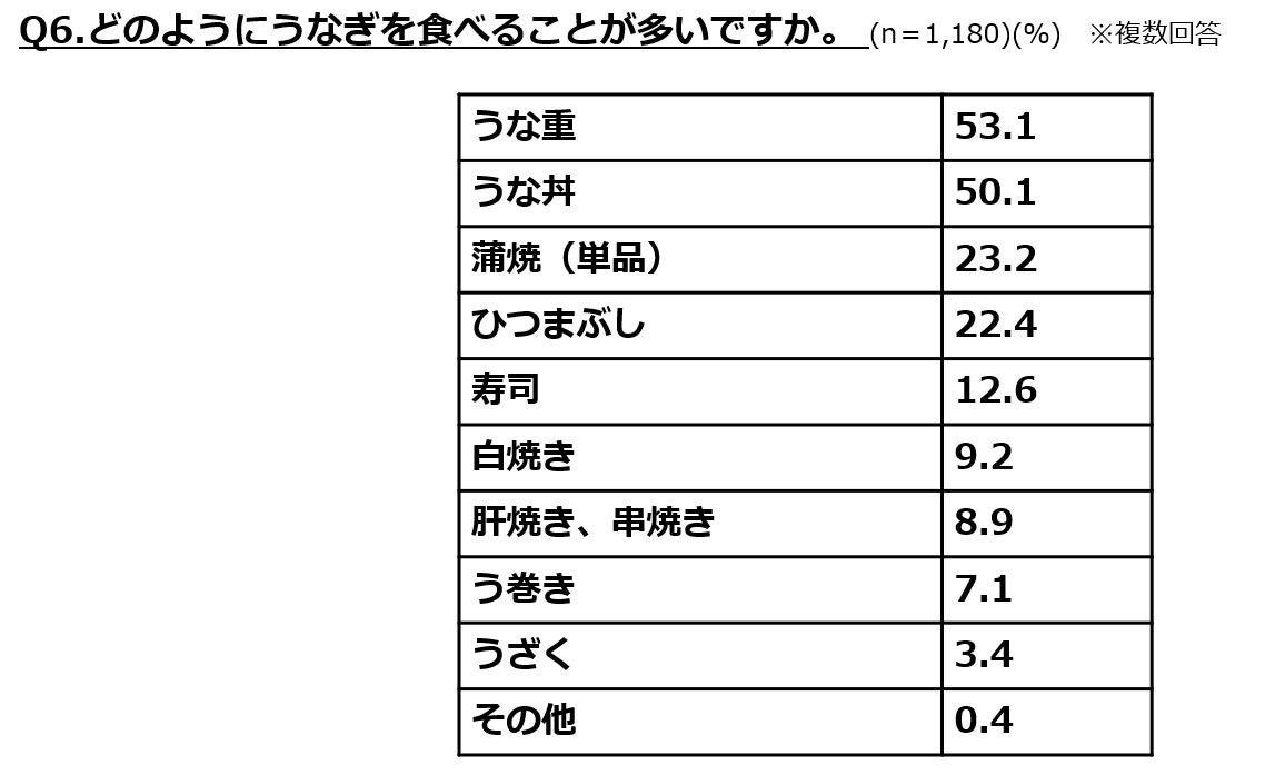 ⑥食べ方は「うな重」と「うな丼」が僅差で1位と2位。