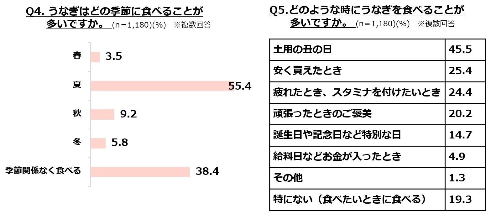 ⑤食べるシーンは「土用の丑の日」が4割以上で最多で、次いで「安く買えたとき」「疲れたとき、スタミナを付けたいとき」「頑張ったときのご褒美」が2割台。