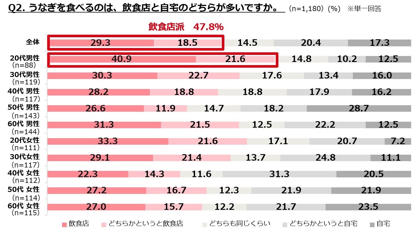 うなぎは9割の方に好まれる、愛され食材であることがわかりました。特に、50代60代男性では嫌いな方を探すのが難しいほどの結果となりました。食べる場所は、飲食店派が自宅派よりやや多く、特に20代男性では6割強が飲食店派と回答しており、飲食店でより本格的な味を楽しみたい方が多いことがわかりました。食べる頻度は「半年に1回くらい」、「年に1回くらい」との回答が多いことから、うなぎは、頻度高く食べる日常の食べ物ではなく、特別なものである様子もうかがえました。皆様に回答いただいたエピソードをみると、うなぎを子どもの頃からの特別な思い出として記憶されている方も多く、だからこそ「特別な時のためのとっておき」になっているのかもしれません。その他に、「疲れた時に食べるもの」「活力源」と考えている方もQ5やエピソードから多くいらっしゃることがわかりましたが、最近は、手軽にいただけるうなぎのお店やメニューも増えてきましたので、「特別な時のためのとっておきのうなぎ」と「疲れた時のためのふだんのうなぎ」、両方楽しむことができそうです。年の瀬で忙しく、疲れていらっしゃる皆様、ぜひ今夜はうなぎにしてみては?