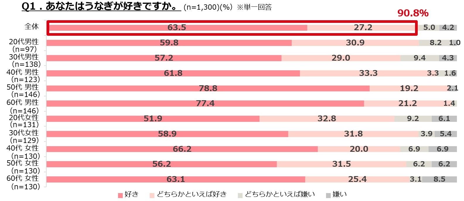 ①うなぎが好きな人は9割。特に「好き」は50~60代男性で高く、最も低いのは20代女性。
