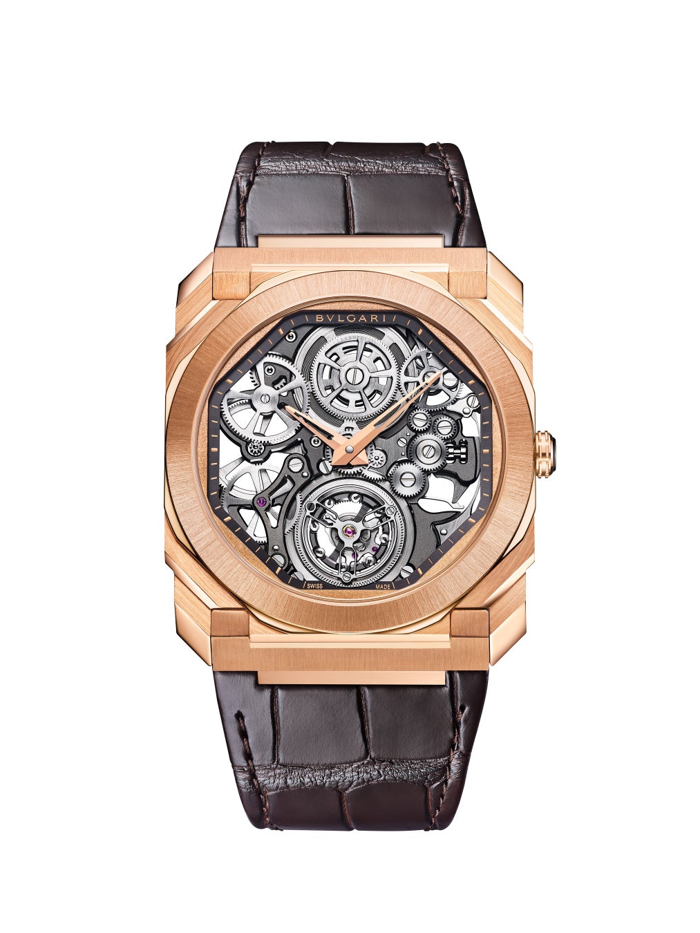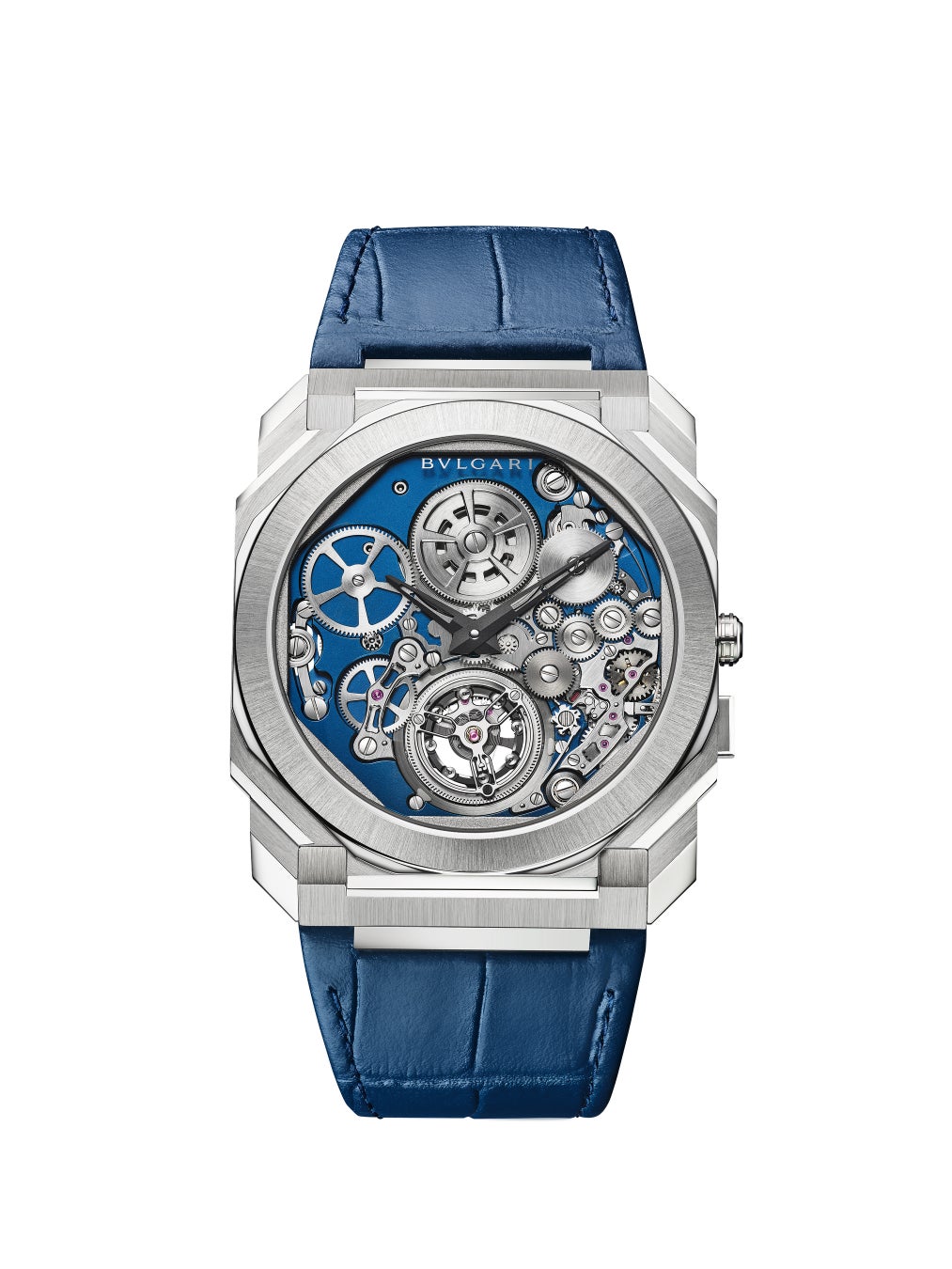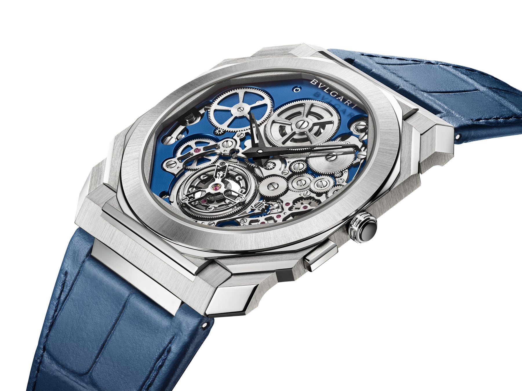 「オクト フィニッシモ トゥールビヨン」は、マイクロブラスト仕上げのブルーが美しい1.95mmの自動巻きBVL288マニュファクチュールキャリバーを搭載しています。径42mm、厚さ4.95mmのプラチナ製ケースにはサテンおよびポリッシュ加工が施され、6 時位置のフライングトゥールビヨンを含むこの超複雑機構を駆動しているすべてのホイールとギアを覗かせています。
