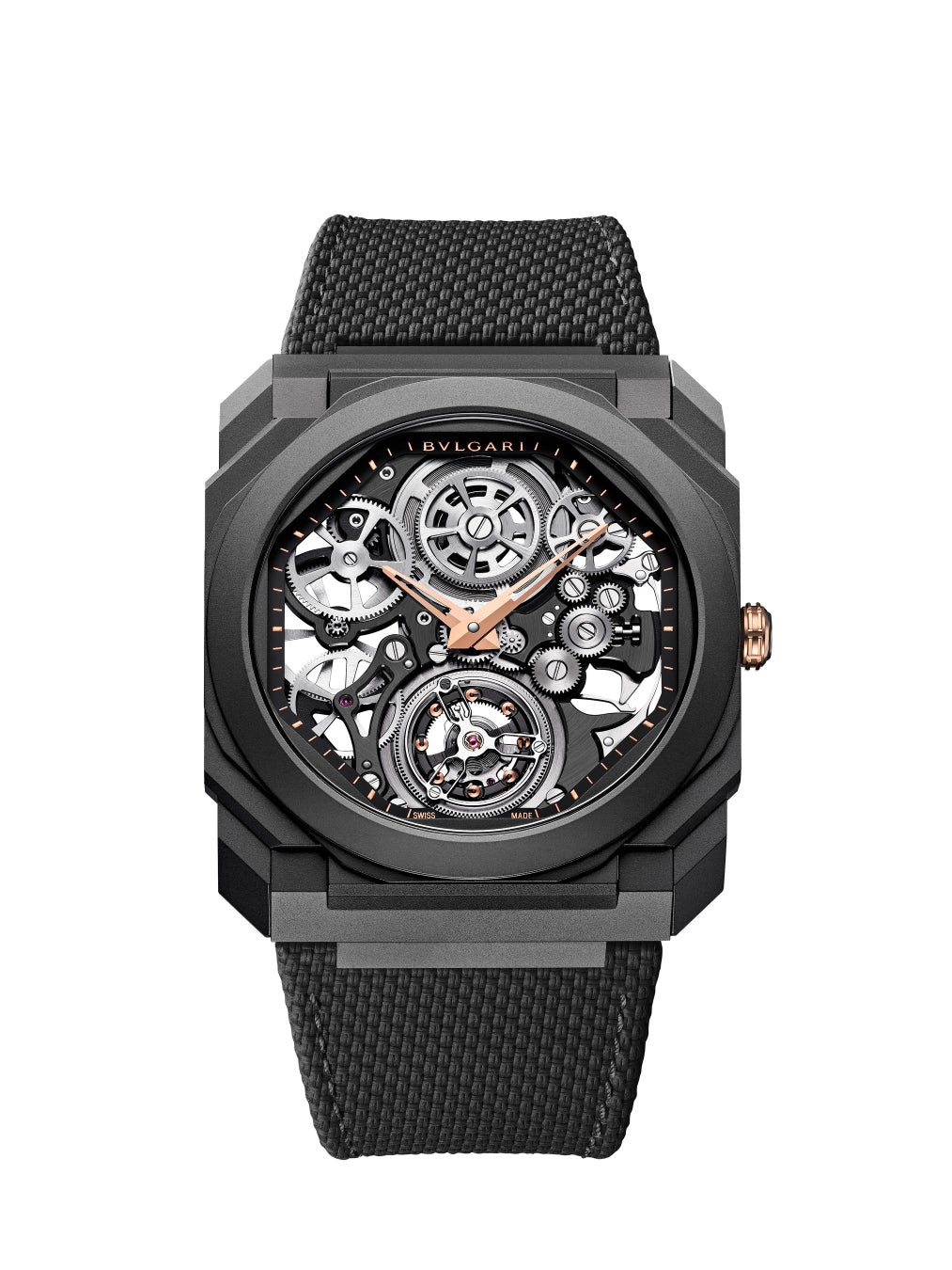 技巧の高さとスタイルを体現するこのブルガリのアイコンコレクションから、新たな「オクト フィニッシモ トゥールビヨン」が3モデル発表されます。ピンクゴールド製「オクト フィニッシモ トゥールビヨン マニュアル」は、ムーブメントの1.95mmという薄さだけではなく、その軽やかな感覚も魅力的なピースです。それぞれサテンとポリッシュ仕上げが施された40mmケースに収められたスケルトンのトゥールビヨンは複雑機構を持つ世界最薄のトゥールビヨンムーブメントBVL268SK自社製キャリバーを搭載しています。このフライングトゥールビヨンムーブメントはマイクロブラストグレー仕上げにより強化され、52時間のパワーリザーブを備えています。同じBVL268SKマニュファクチュールキャリバーにサテンブラック仕上げを施した「オクト フィニッシモ トゥールビヨン マニュアル」は、DLC加工チタン製径40mmケースを採用しています。ピンクゴールドの針とチャプターリングが目を捉え、ケースとラバーストラップのブラックとのコントラストが際立っています。ブルガリが重視してきた素材と色の組み合わせが、このうえなく完璧な形で大胆さをウォッチ上で表現しています。
