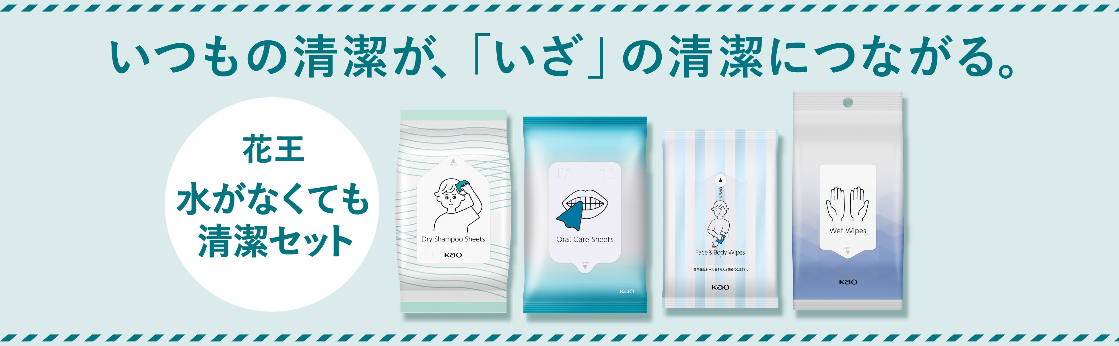 そこでこの度、「いつどんなときでも、清潔に過ごしてほしい」という思いのもと、水が使用できない場面でも、髪の毛、歯、顔、体、身のまわりのものの汚れをふき取ることができる『花王 水がなくても清潔セット』を一部オンラインショップ限定で新発売いたします。