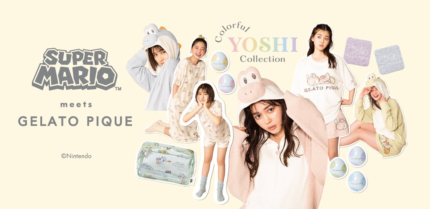 なお、ジェラート ピケ公式オンラインストアおよびUSAGI ONLINEでは、4月19日(火)12:00より3名のモデルを起用し、パステルカラーでカラフルなヨッシーたちの世界を表現した特設WEBページを公開いたします。