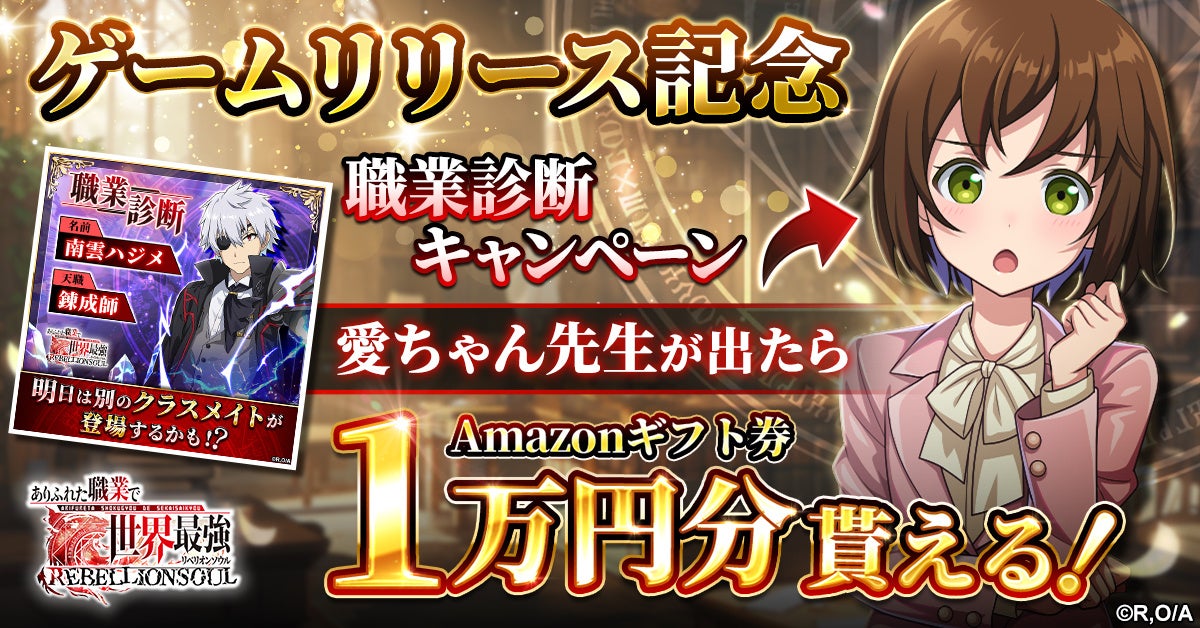 ゲームのリリースを記念して、公式Xにてキャンペーンを開催いたします。対象の投稿からゲームを開始すると、ランダムで異世界に召喚されたキャラクターと天職の情報が表示されます。さらに、「愛ちゃん先生」が登場した場合、その場でAmazonギフト券1万円分をプレゼントいたします。