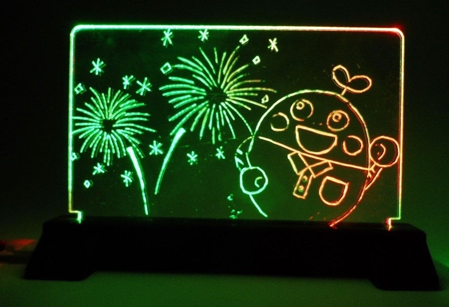 アクリル板に好きなデザインを彫って、LEDライトが 10 個付いたLEDボードで下から照らします。 micro:bitを用いたプログラミングでピカピカ点滅させたり、グラデーションのように光らせたりすることができます。