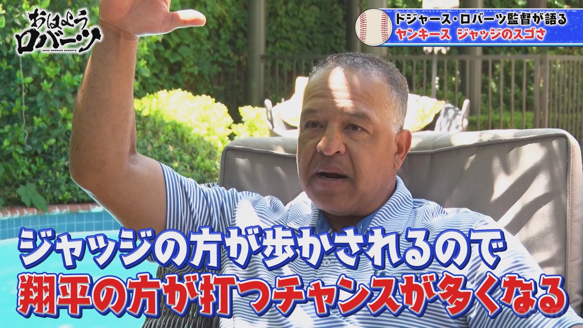 さらに、5月31日(土)から始まるニューヨーク・ヤンキースとの3連戦における大谷選手とジャッジ選手の“MVP競演”を前に、ロバーツ監督は「今季はジャッジよりも翔平の方がホームランを打つと思う」と大予想。その理由を「翔平はジャッジほど四球を選ばないし、ジャッジの方が歩かされるので、打席数は同じだが翔平の方が打つチャンスが多くなる」と語りました。