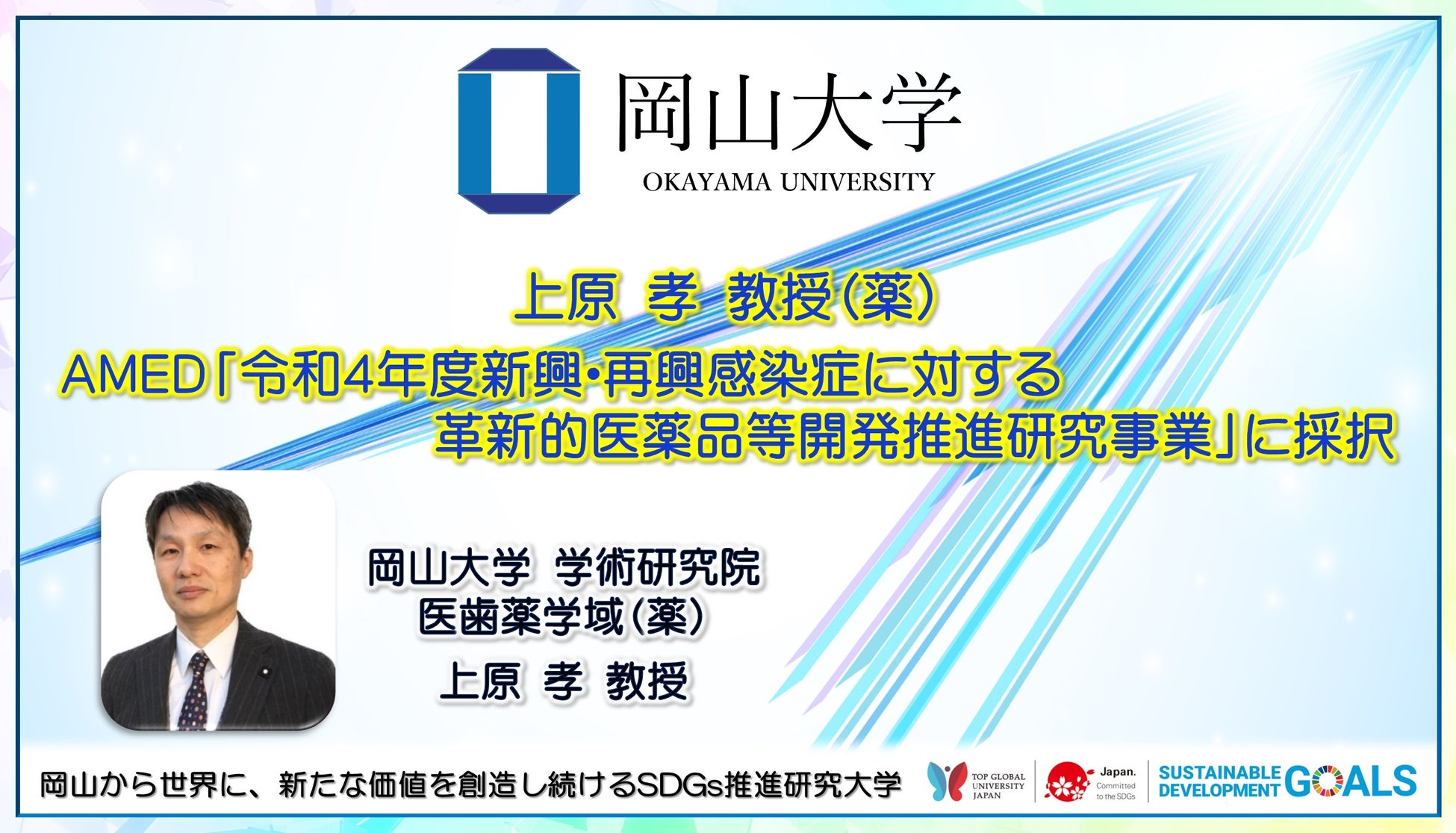 【岡山大学】上原孝教授(薬)がAMED「令和4年度新興・再興感染症に対する革新的医薬品等開発推進研究事業」に採択
