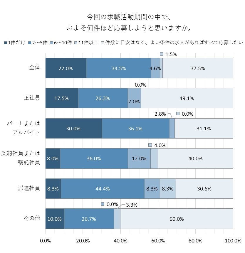 希望雇用形態別にみると、「正社員」では、「件数に目安はなく、良い条件の求人があればすべて応募したい」の割合は49.1%で最も多く、約半数は目安を設けていないことがわかった。「パートまたはアルバイト」では「2~5件」応募するとした割合が36.1%、「1件だけ」が30.0%で、応募件数に目安を設けて活動している人が多いようだ。