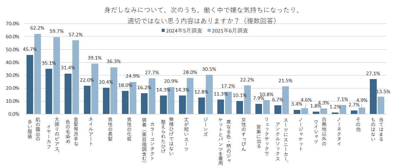 適切ではないと思う身だしなみ、「肌の露出の多い服装」が45.7%で最多。2021年の調査時と比較すると、いずれの選択肢も選択割合が大きく減少