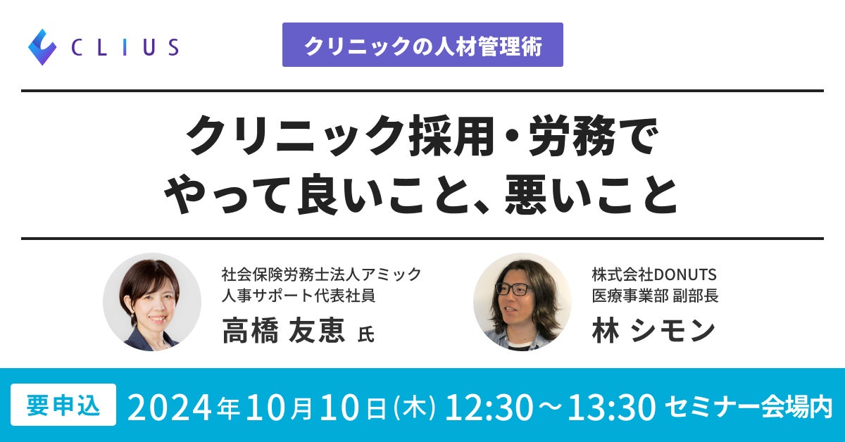 本講演では「クリニックの人材管理術~クリニック採用・労務のやって良いこと・悪いこと~」と題し、社会保険労務士法人アミック人事サポート 代表社員の高橋友恵様と株式会社DONUTS医療事業部 副部長の林シモンが、クリニック採用の成功の秘訣を解説します。