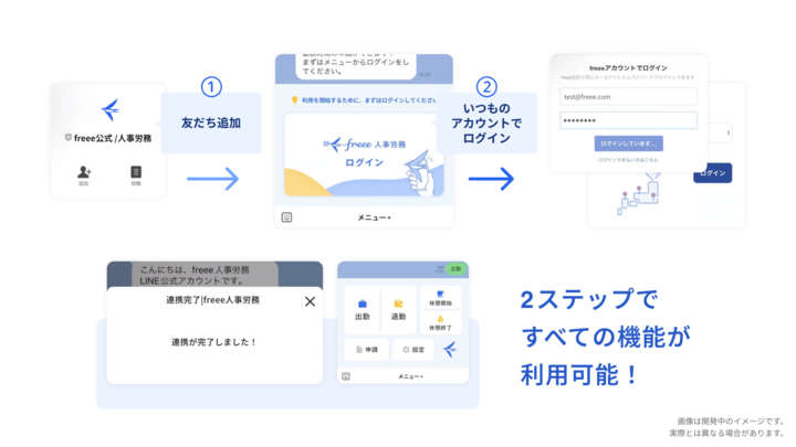 freee人事労務をご利用中の企業の従業員が「freee公式/人事労務」を友達追加し、利用しているアカウントでログインすることですぐに利用を開始できます。