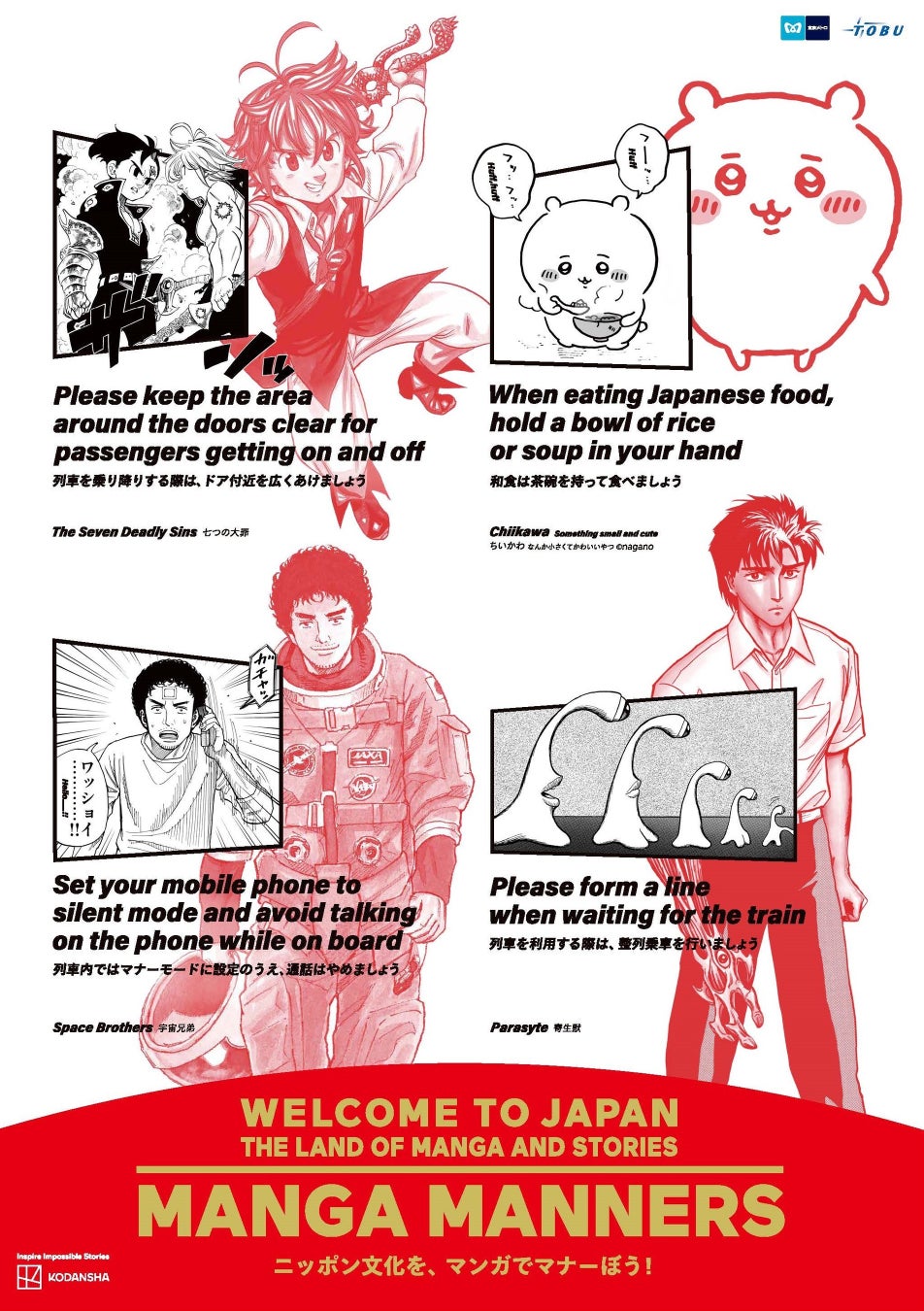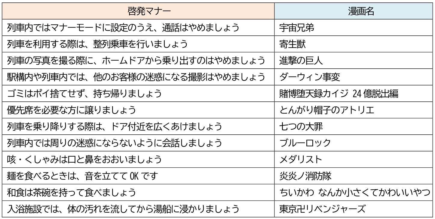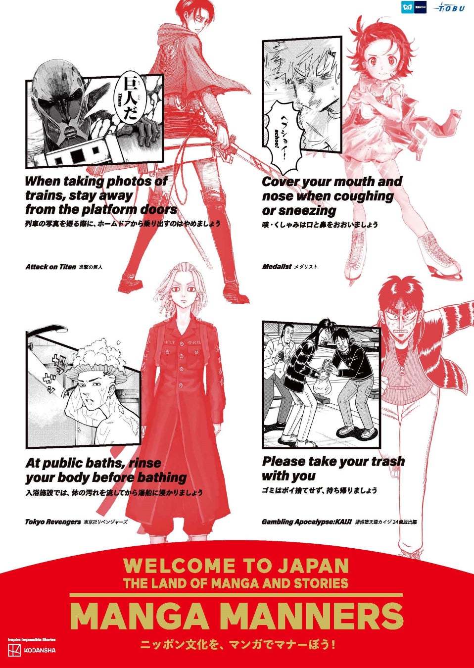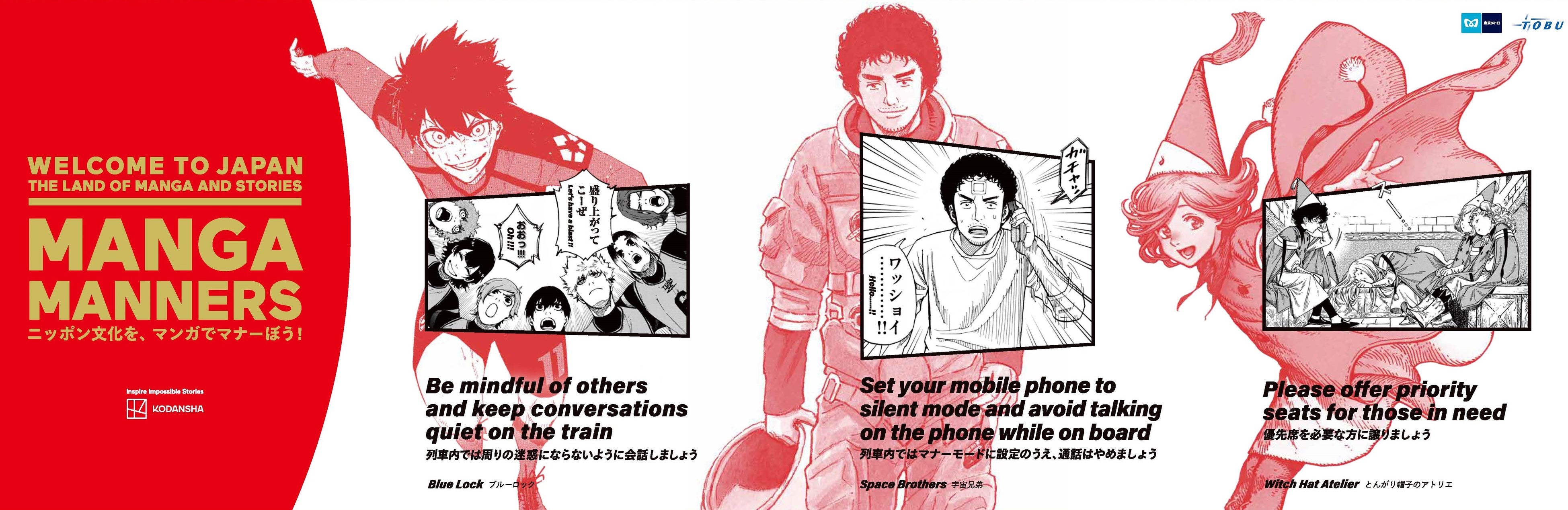 東京地下鉄株式会社(本社:東京都台東区、代表取締役社長:小坂 彰洋、以下「東京メトロ」)と東武鉄道株式会社(本社:東京都墨田区、代表取締役社長:都筑 豊、以下「東武鉄道」)は、2026年3月30日(月)から講談社の漫画キャラクターを活用し、訪日外国人のお客様に向け、鉄道利用や日常生活における日本のマナーを楽しく紹介する『「ニッポン文化を、マンガでマナーぼう!」 “MANGA MANNERS“』によるマナー啓発を実施します。