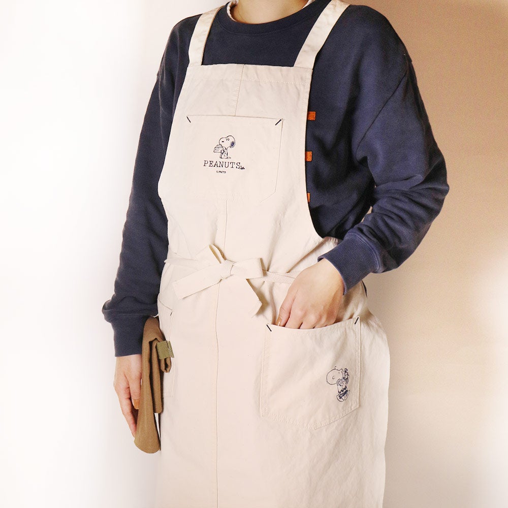 スヌーピーの刺繍を施したファン心をくすぐる見た目と、使い込むほど風合いが変化し、経年変化を楽しめるエプロン