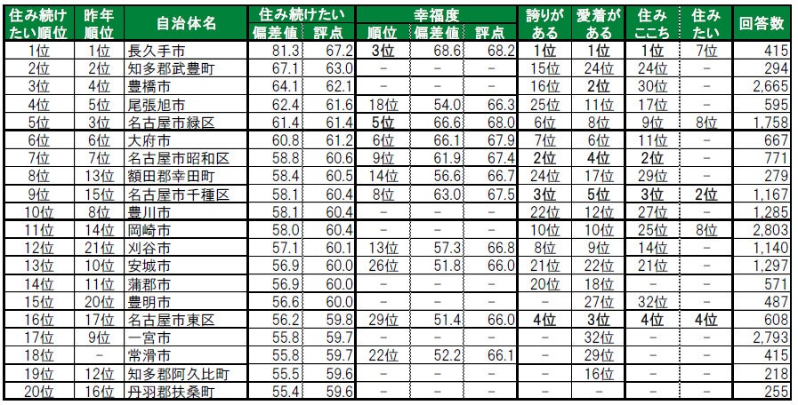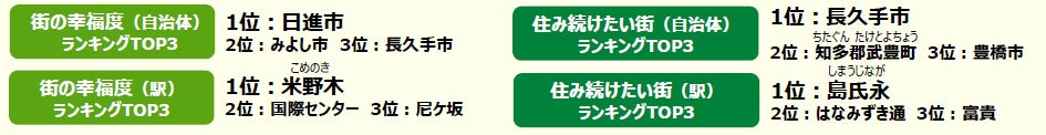 トップ2は3年連続で、1位は日進市、2位はみよし市で、今年も偏差値70台の高い評価を得ています。3位は昨年5位から順位を上げた長久手市で、「住みここち」をはじめとする4つのランキングで1位の高い評価を得ています。